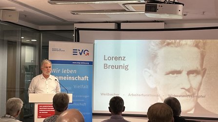 Burkert dankte den Organisator:innen des digitalen Gedenkorts, allen voran Erika Albers, Sprecherin des Arbeitskreises EVG Geschichte. Sie hatte die Veranstaltung eröffnet und die Ehrengäste begrüßt, die vor Ort und zum Teil digital zugeschaltet waren.
