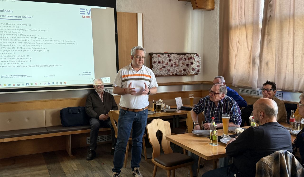 Ingbert Hautsch würdigte anschließend die Initiative und das große Engagement von den „Jungen Senioren“ in Nürnberg und dankte Werner Honisch und Roland Brütting für ihren großen Einsatz. Ein besonderer Dank galt auch Beate Fleischmann, die sich intensiv um digitale Themen kümmert und regelmäßig in den sozialen Medien über die Aktivitäten der Seniorinnen und Senioren im OV Nürnberg berichtet. Zudem stellte er Angebote des Ortsverbandes für aktive EVG-Mitglieder und deren Familien vor, wie etwa Sommerfeste oder gemeinsame Ausflüge – zum Beispiel in den Playmobil-Park. Für dieses Jahr ist unter anderem ein Besuch der Rodelbahn in Pleinfeld geplant.