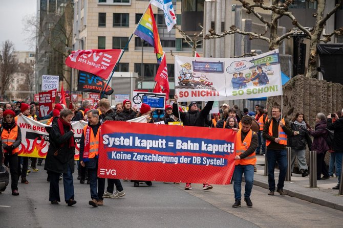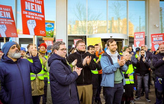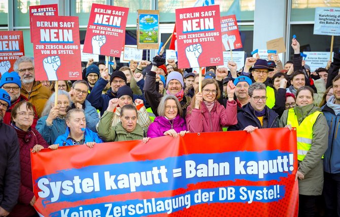 Mehrere hundert Kolleginnen und Kollegen aus dem Bereich DB Systel machten ihrer Wut gegen die Pläne der Konzernführung heute Luft. An drei Standorten ergab das insgesamt einen eindrucksvollen Protest gegen die drohende Zerschlagung des hauseigenen IT-Dienstleisters.