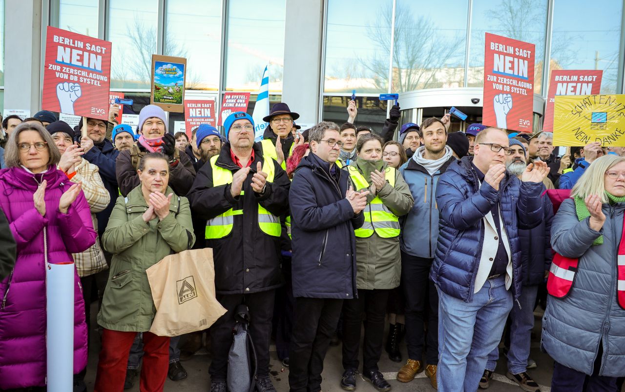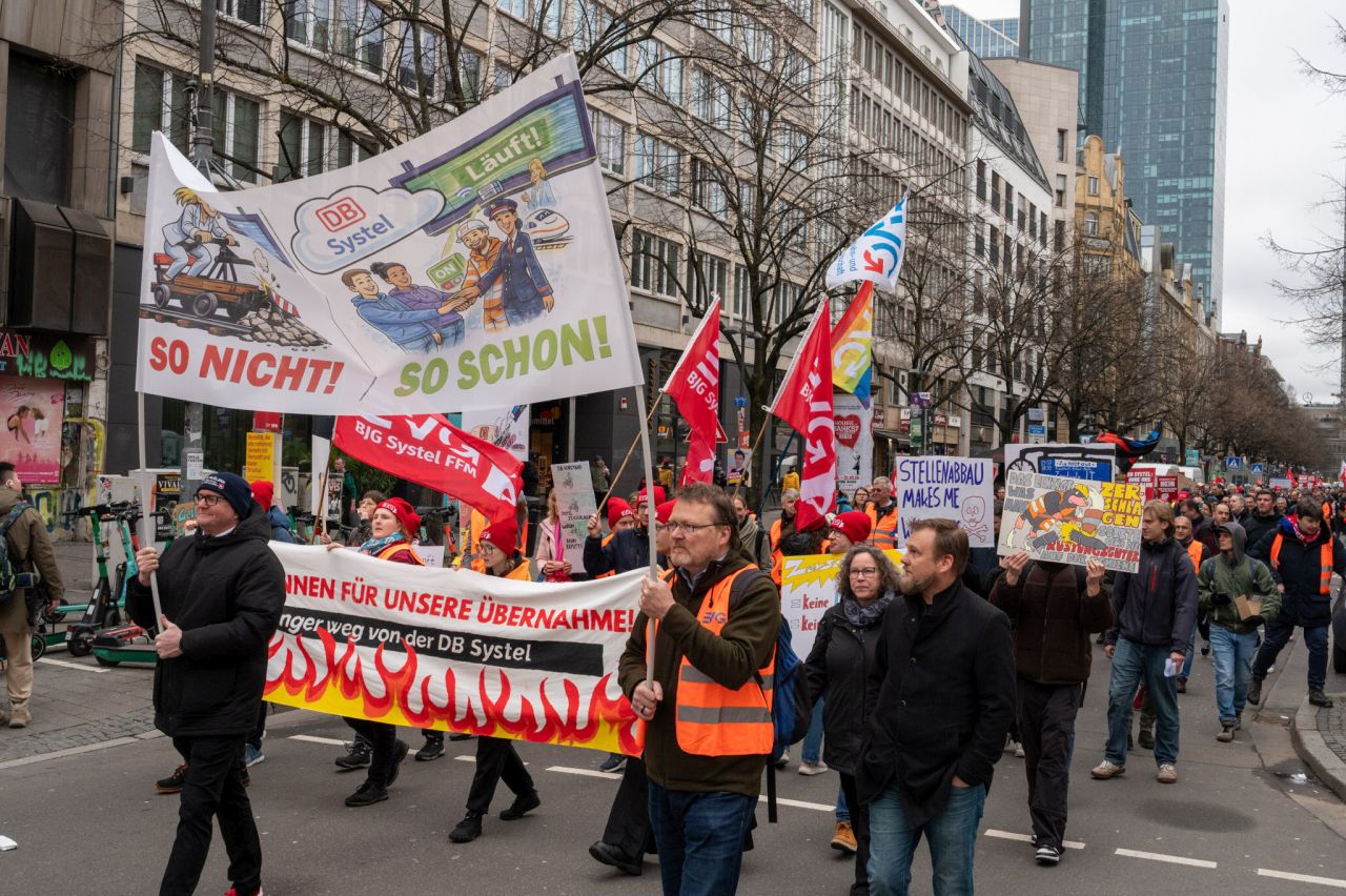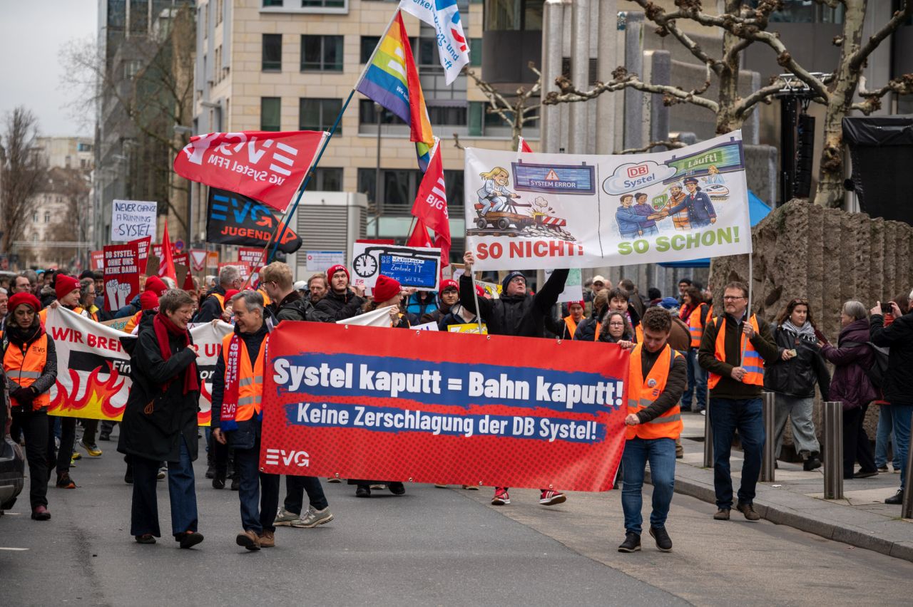 Die Deutsche Bahn steht vor einem massiven Umbau - und ausgerechnet ihr digitales Rückgrat soll dabei geschwächt werden. Nach aktuellen Plänen könnten bei DB Systel bis zu zwei Drittel der Arbeitsplätze wegfallen. Daher haben am Mittwoch in Frankfurt/ Main, Berlin und Erfurt Protestaktionen stattgefunden.