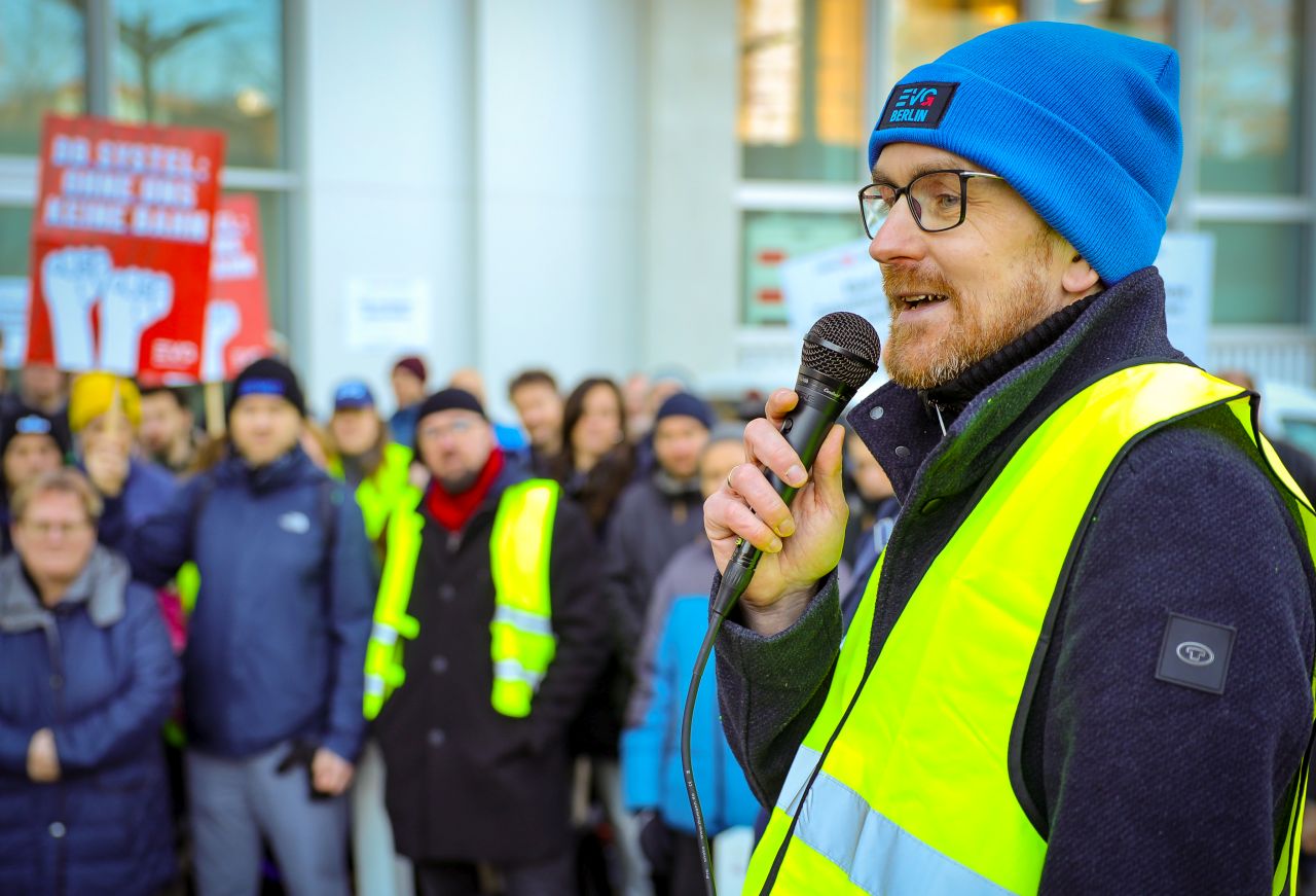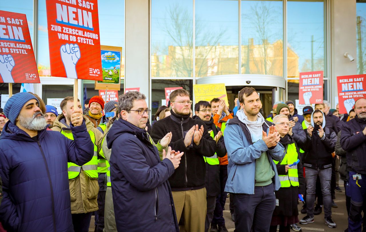 In der Hauptstadt versammelten sich rund 150 Beschäftigte vor dem Gebäude der DB Systel GmbH. Fabian Sawall, Vorsitzender der EVG-Betriebsgruppe, fand klare Worte zu den unklaren Plänen der Deutsche Bahn AG, die so viele verunsichern. „Wir wollen nicht kaputtstrukturiert werden“, mahnte er unter großem Applaus.