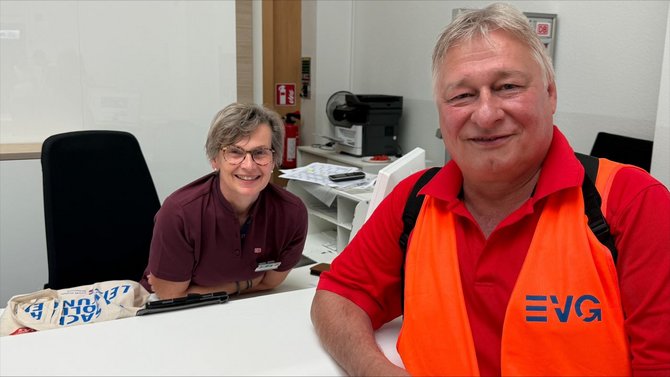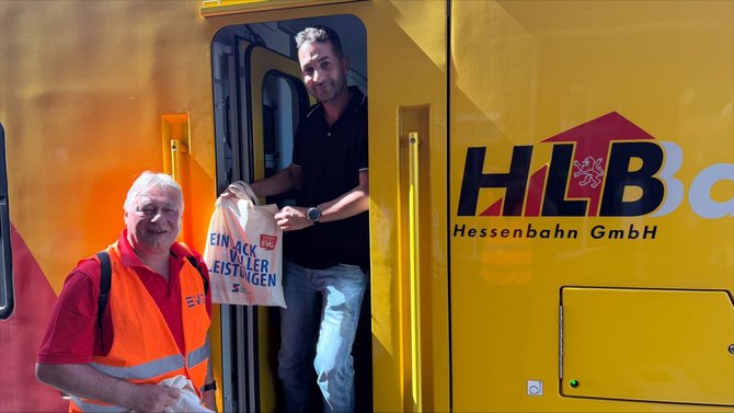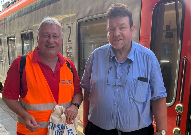 „Als es jüngst so heiß war, haben wir kostenlos Wasserflaschen verteilt - das kam unheimlich gut an“, erzählt er. Auch die aktuelle Aktion anlässlich des Besuchs von Martin Burkert während der diesjährigen Sommertour stieß auf großes Interesse. Gemeinsam mit dem EVG-Vorsitzenden wurden am Bahnhof zahlreiche Infobeutel - mit einem kleinen Pausensnack - an Triebfahrzeugführerinnen, Triebfahrzeugführer sowie Zugbegleiterinnen und Zugbegleiter verteilt. Dabei ergaben sich immer wieder kurze, interessante Gespräche.