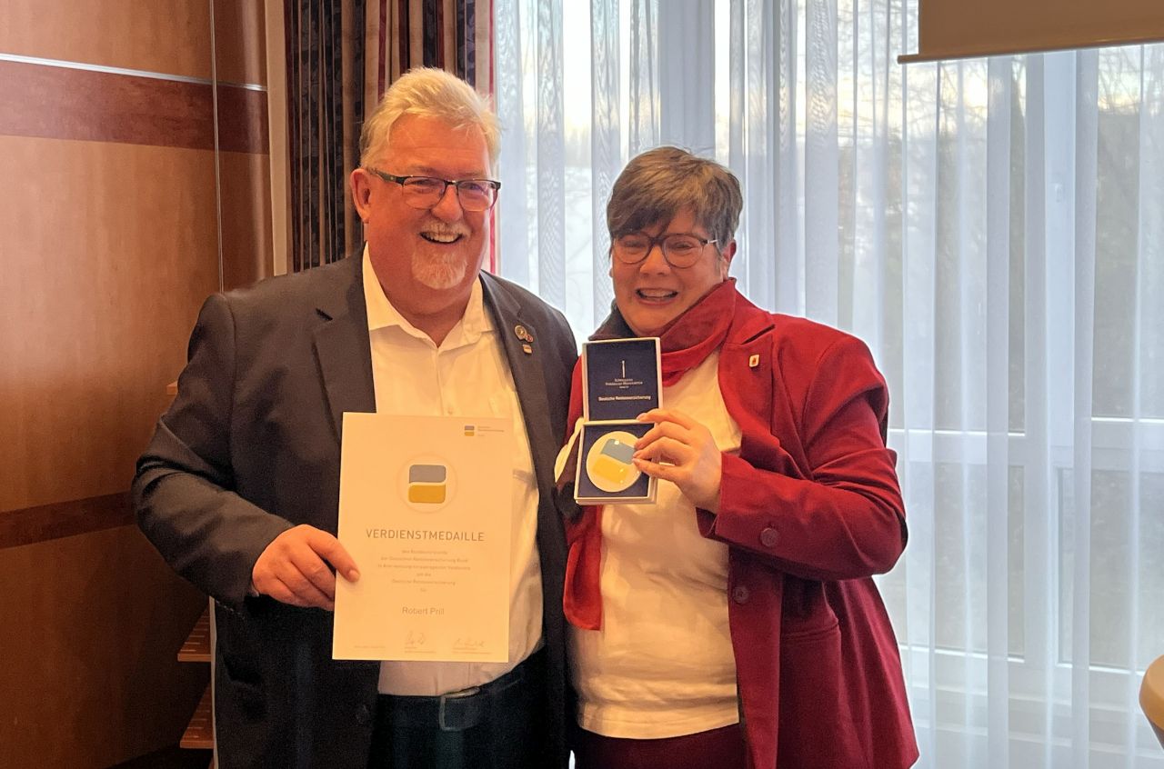 Zum Abschied erhielt Robert Prill eine besondere Auszeichnung: die Verdienstmedaille der Deutschen Rentenversicherung für sein jahrzehntelanges Wirken in der Selbstverwaltung. Überreicht wurde sie von Birgit Biermann, stellvertretende Vorsitzende der IGBCE und alternierende Vorsitzende des Vorstands der Knappschaft-Bahn-See. Sie würdigte Robert als eine „wichtige Stimme der Versicherten“ in der sozialen Selbstverwaltung. Diese sei ein „lebenswichtiges Strukturelement“, das jedoch derzeit nicht ausgehöhlt werden dürfe. Der Sozialstaat sei „kein dürrer Ast, sondern ein kräftiger Stamm unserer demokratischen Gesellschaft“. „Du hast immer für diesen Stamm gekämpft.“