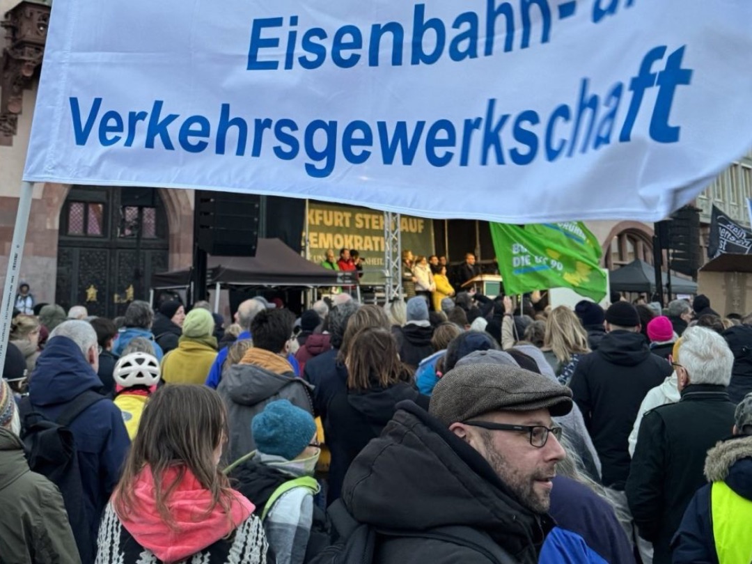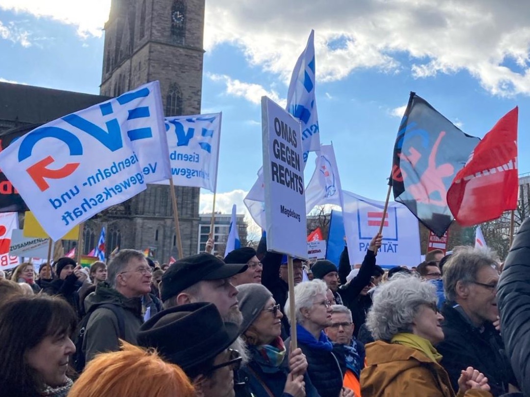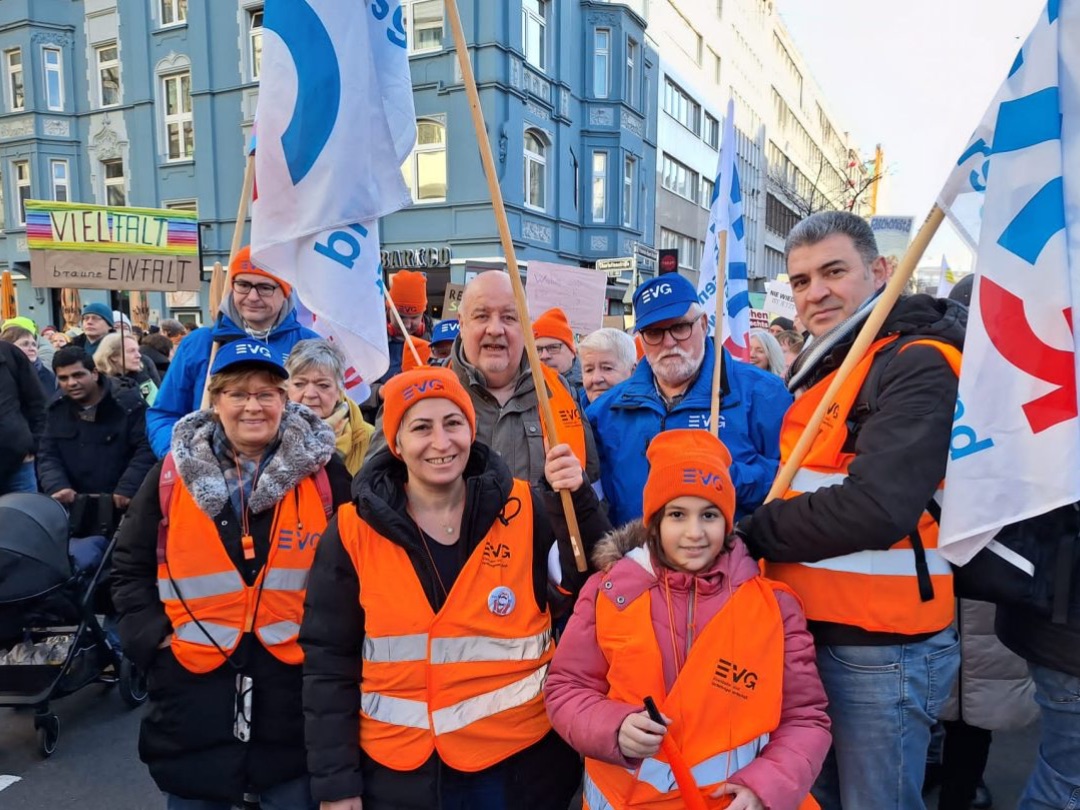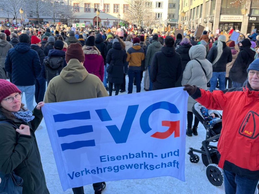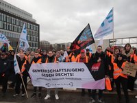 Und Mirko Schade, Betriebsrat bei DB Services, ist „heute hier, um Gesicht zu zeigen - gegen die AfD, gegen Rassismus, gegen Menschenfeindlichkeit. Und ich hoffe, dass sich viele Menschen an den anstehenden Wahlen beteiligen und ihr Kreuz gegen Rechts machen." Die bestürzenden correctiv.org-Enthüllungen zum konspirativen Treffen von Rechtsextremen und AfD-Politiker:innen erinnern an das dunkelste Kapitel der deutschen Geschichte.