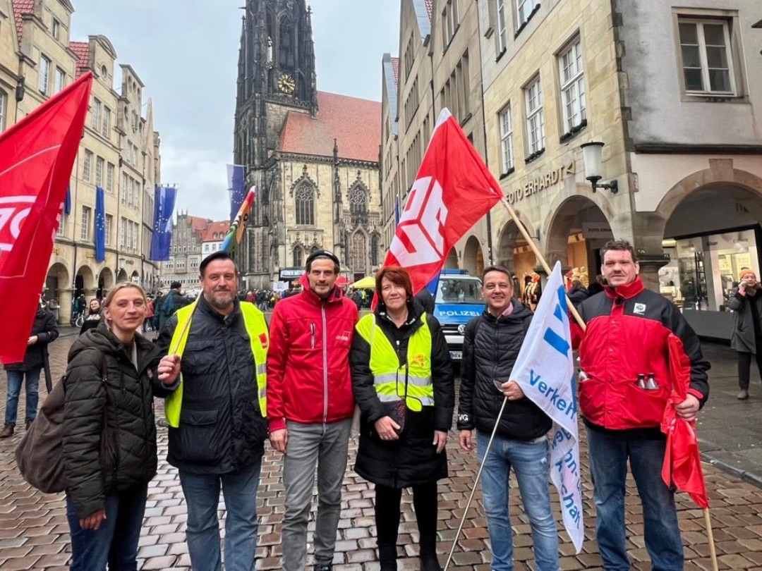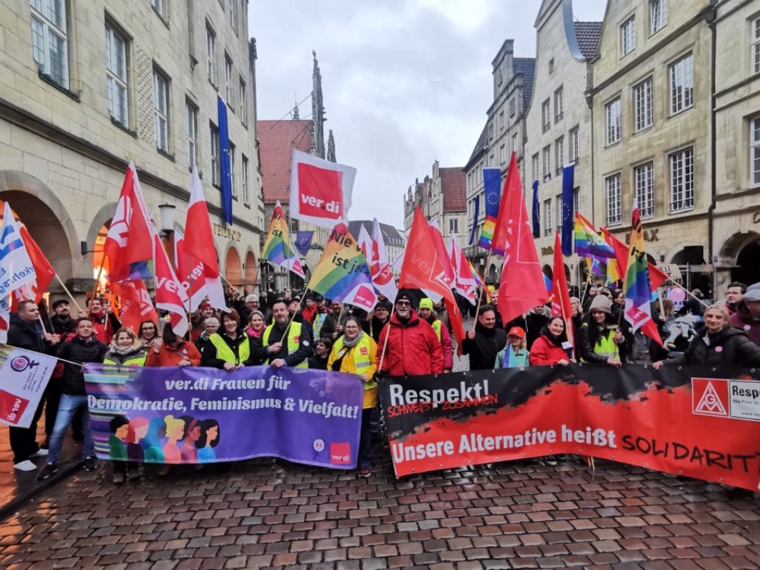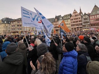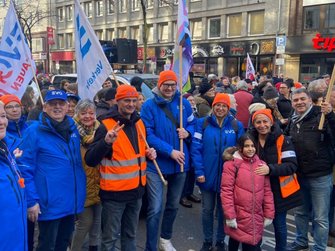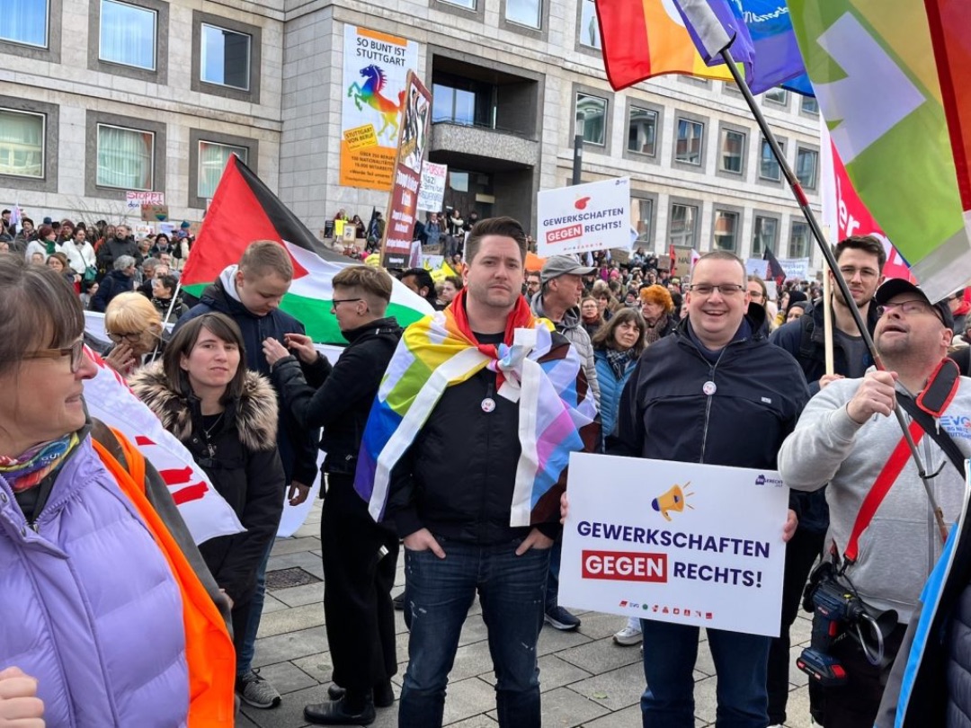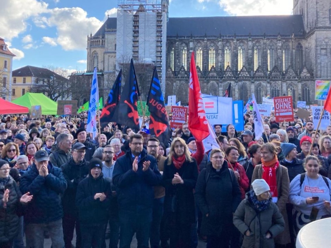 Und Mirko Schade, Betriebsrat bei DB Services, ist „heute hier, um Gesicht zu zeigen - gegen die AfD, gegen Rassismus, gegen Menschenfeindlichkeit. Und ich hoffe, dass sich viele Menschen an den anstehenden Wahlen beteiligen und ihr Kreuz gegen Rechts machen." Die bestürzenden correctiv.org-Enthüllungen zum konspirativen Treffen von Rechtsextremen und AfD-Politiker:innen erinnern an das dunkelste Kapitel der deutschen Geschichte.