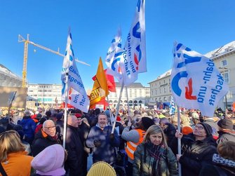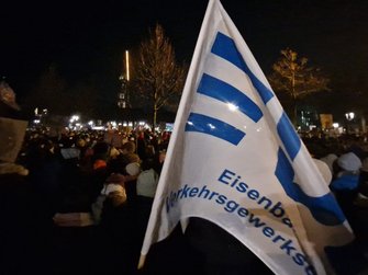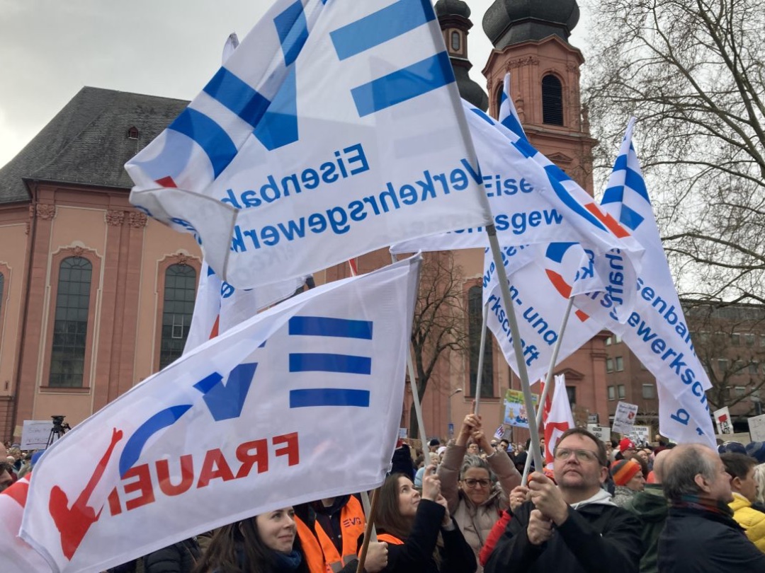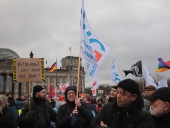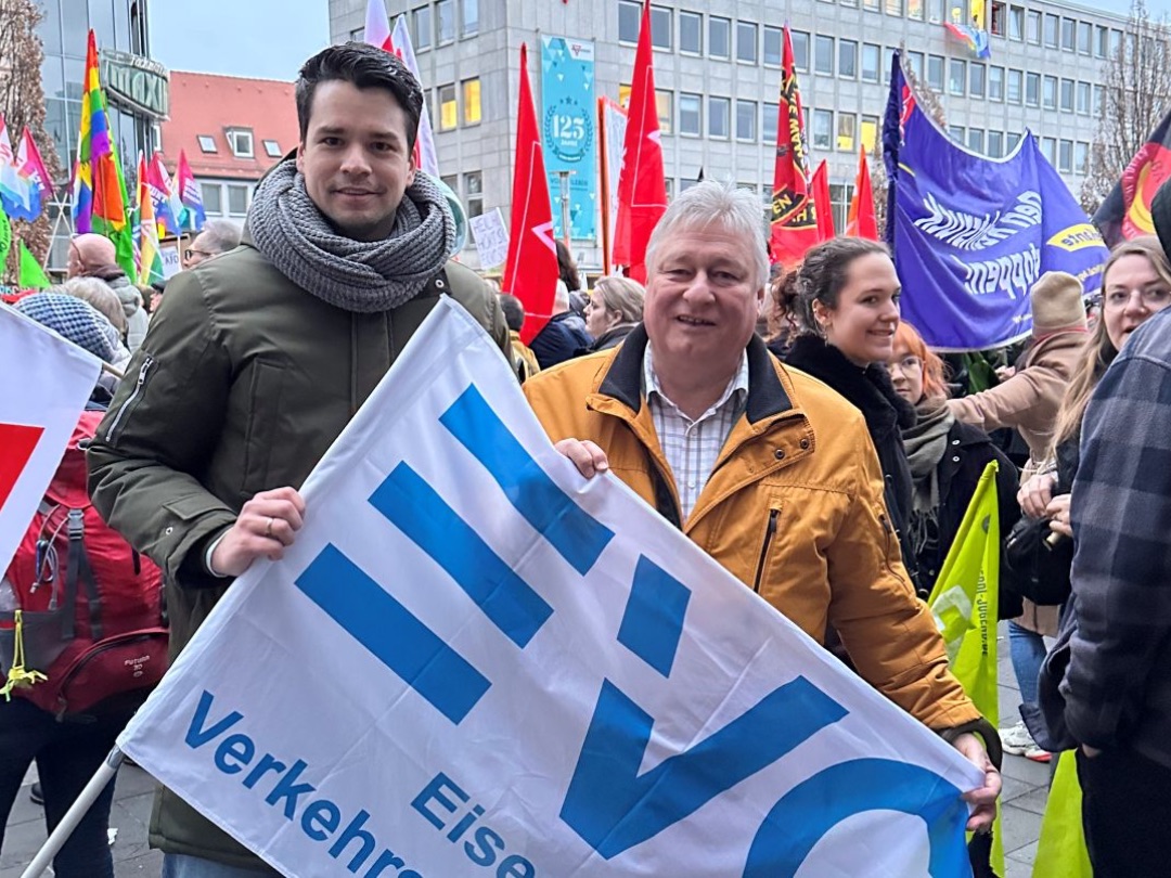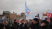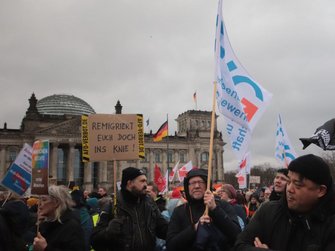 Von einem „tollen Zeichen“ spricht Berlins EVG-Landesvorsitzender Michael Bartl. „Wir stehen hier vor dem Reichstag. Vor noch nicht langer Zeit haben einige Spinner versucht, den Reichstag zu stürmen. Und es ist wichtig, dass so viele Menschen hier stehen und sagen: Wir sind das Volk, und nicht diese kleine Splittergruppe.“