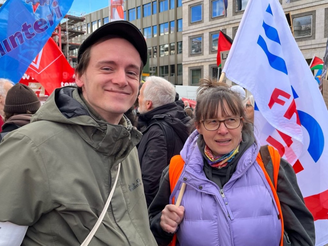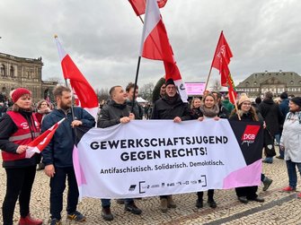 Ein klares Zeichen setzt auch Berlins OJL-Vorsitzender Florens Fröhlich, der mit Freundinnen und Freunden, Kolleginnen und Kollegen zur Kundgebung gekommen ist. „Gerade die Gewerkschaften haben unter den Nazis gelitten. Gewerkschafter:innen wurden drangsaliert und verfolgt, da ist es für uns eine Verpflichtung, als Gewerkschaften hier zu sein.“