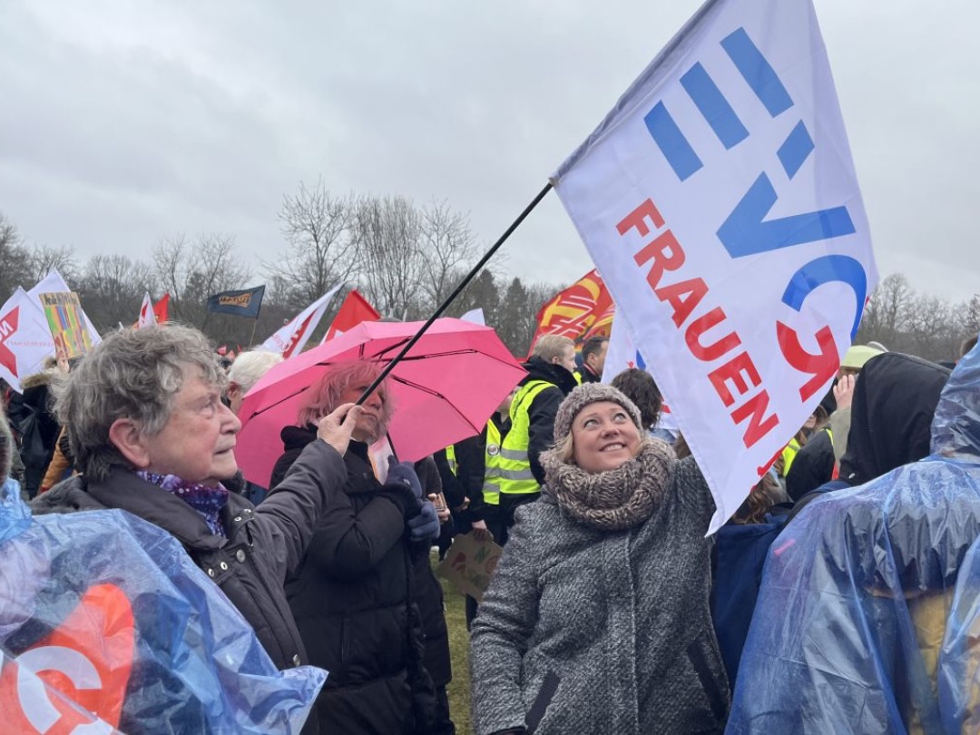 Heidi Zeidler ist trotz regnerischen Wetters mit ihren über 80 Jahren extra aus Frankfurt an der Oder zu der Kundgebung gekommen. „Ich bin Gewerkschafterin seit vielen Jahrzehnten und für mich ist es wichtig, mit anderen Gewerkschafterinnen und Gewerkschaftern hier zu demonstrieren. Nicht nur gegen Rechts, sondern auch gegen Sozialabbau."